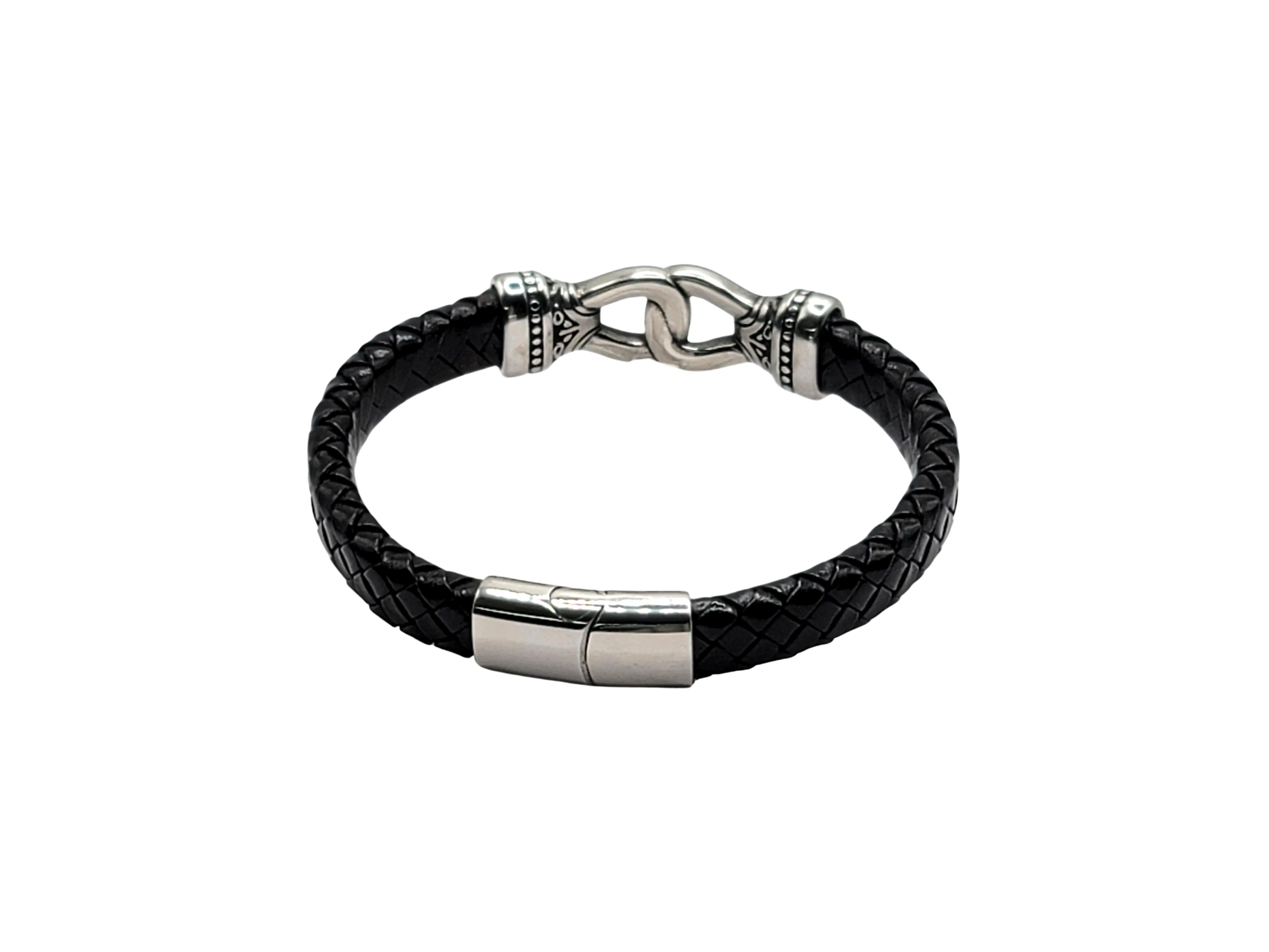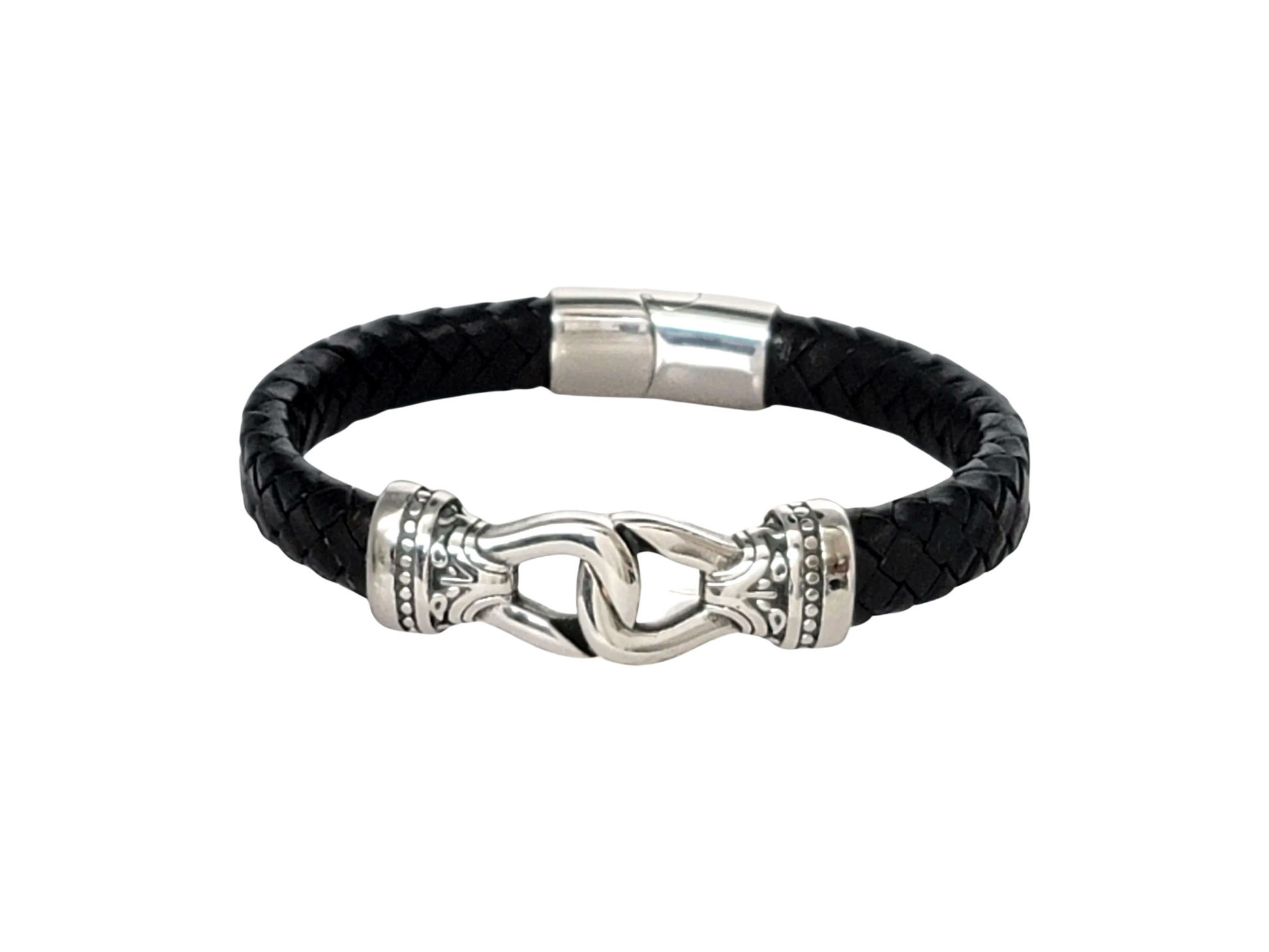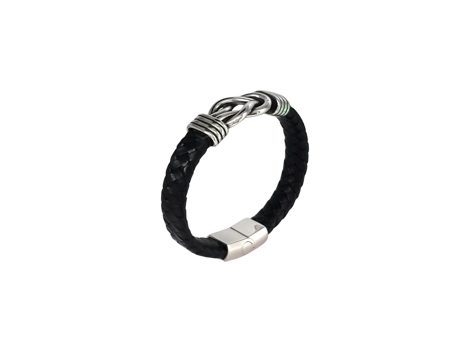 Enhance your style with our Black Braided Leather Stainless Steel Infinity Knot Bracelet. This sophisticated piece features a wide black leather band intricately braided with a high quality stainless steel infinity knot centerpiece. The bracelet is secured with a convenient magnetic clasp for easy wear. Perfect for both casual and formal occasions, this bracelet adds a touch of elegance to any outfit. Accent your jewelry collection with this timeless and versatile accessory.