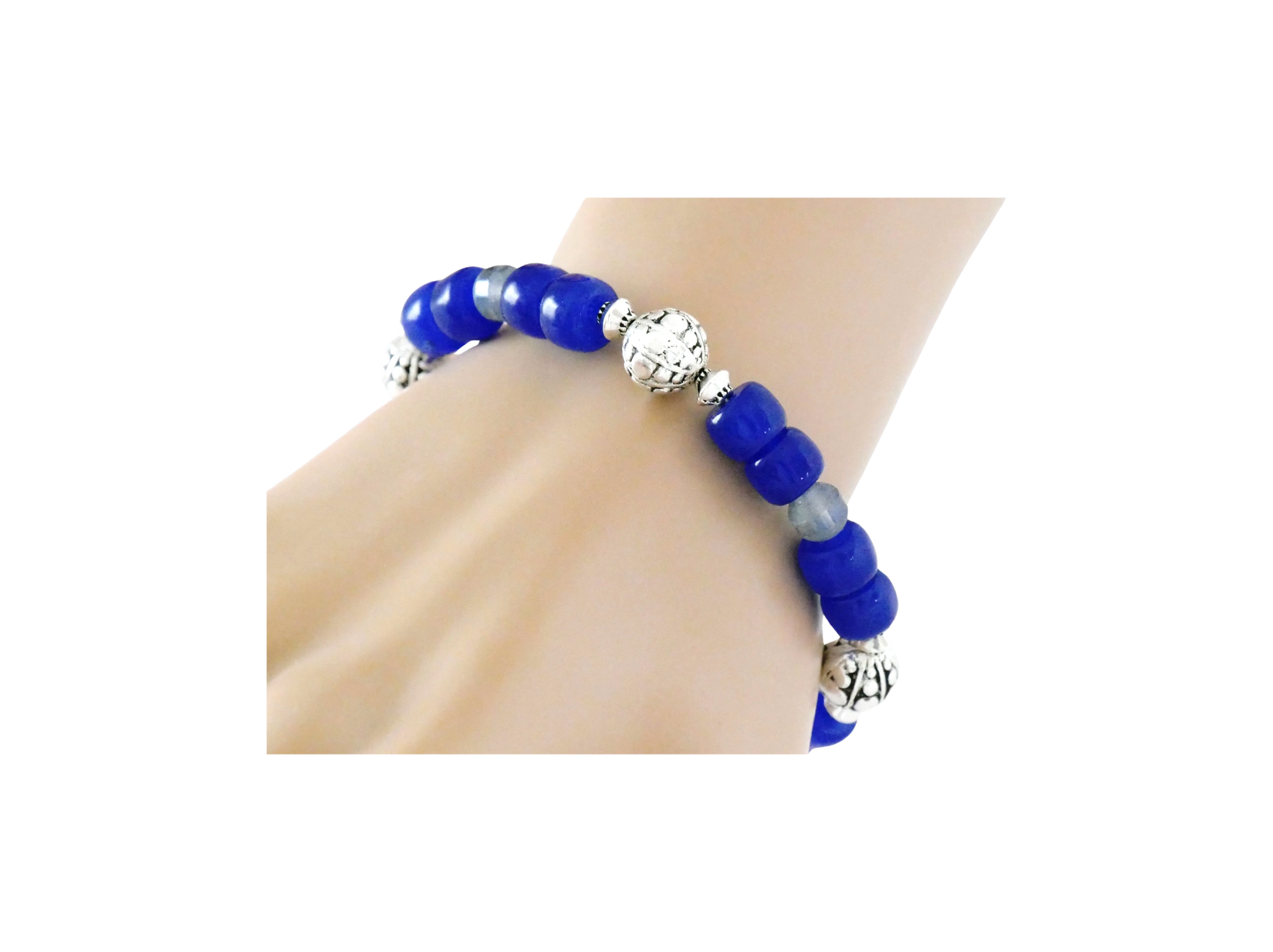 is a beautiful blue jade, silver tone and etched glass beaded bracelet and