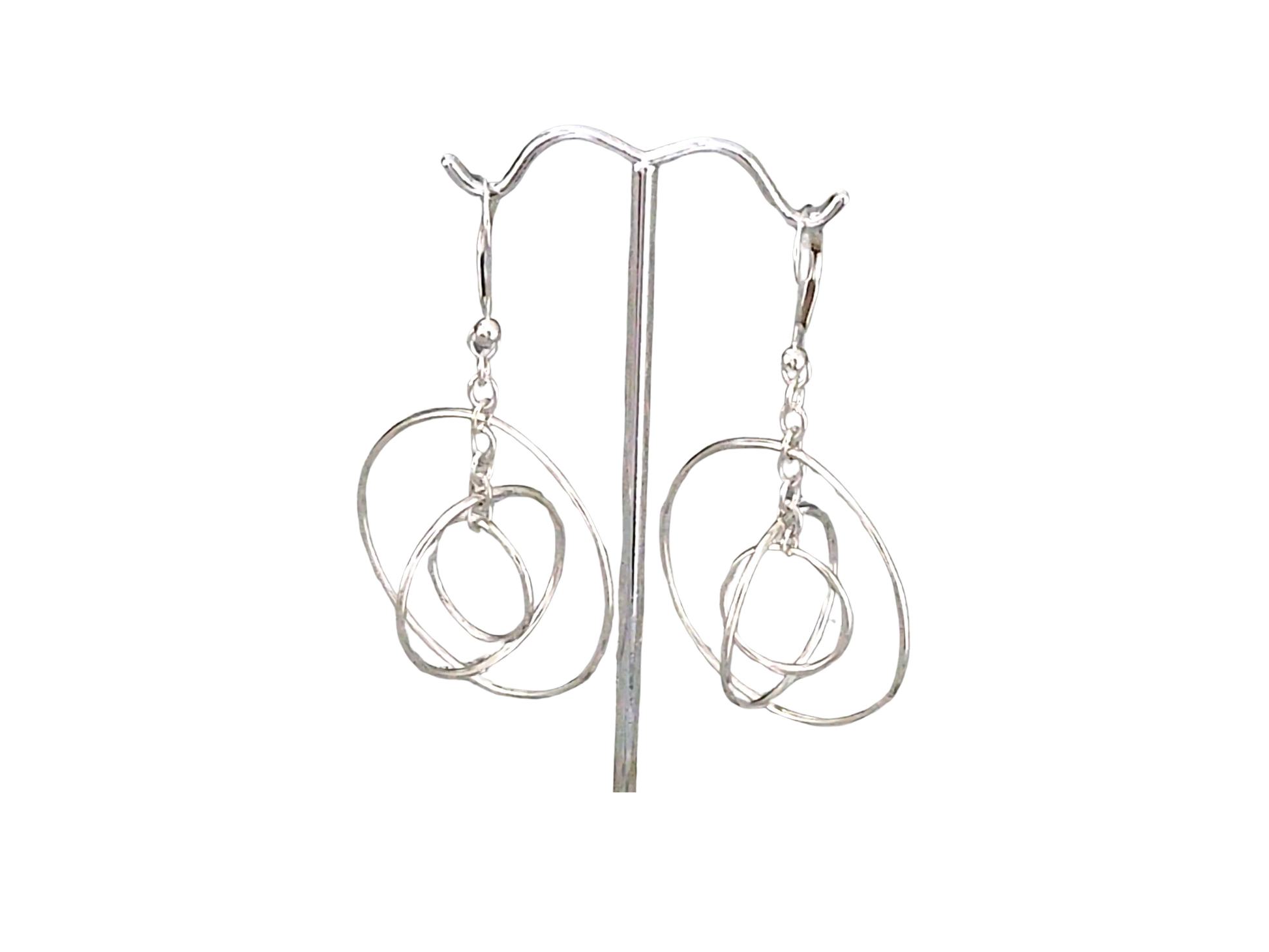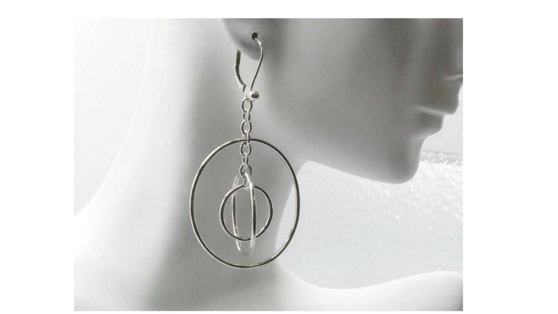 Circles within circles dangle earrings contain genuine .925 sterling silver, sturdy chain and a lever back earring. They dangle 2.5 inches and are positioned within each circle.
